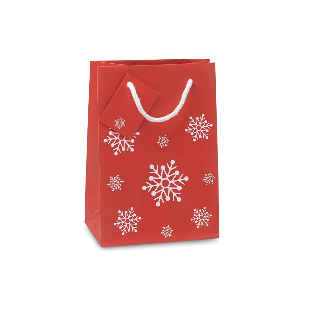 Elegancka torba na prezenty ze wzorem płatków śniegu. Bilecik umieszczony na uchwycie. Rozmiar mały.