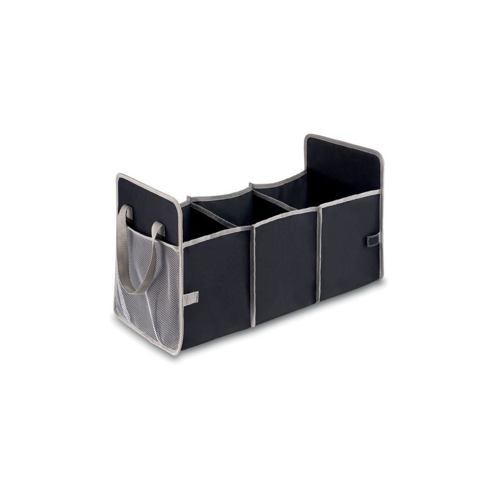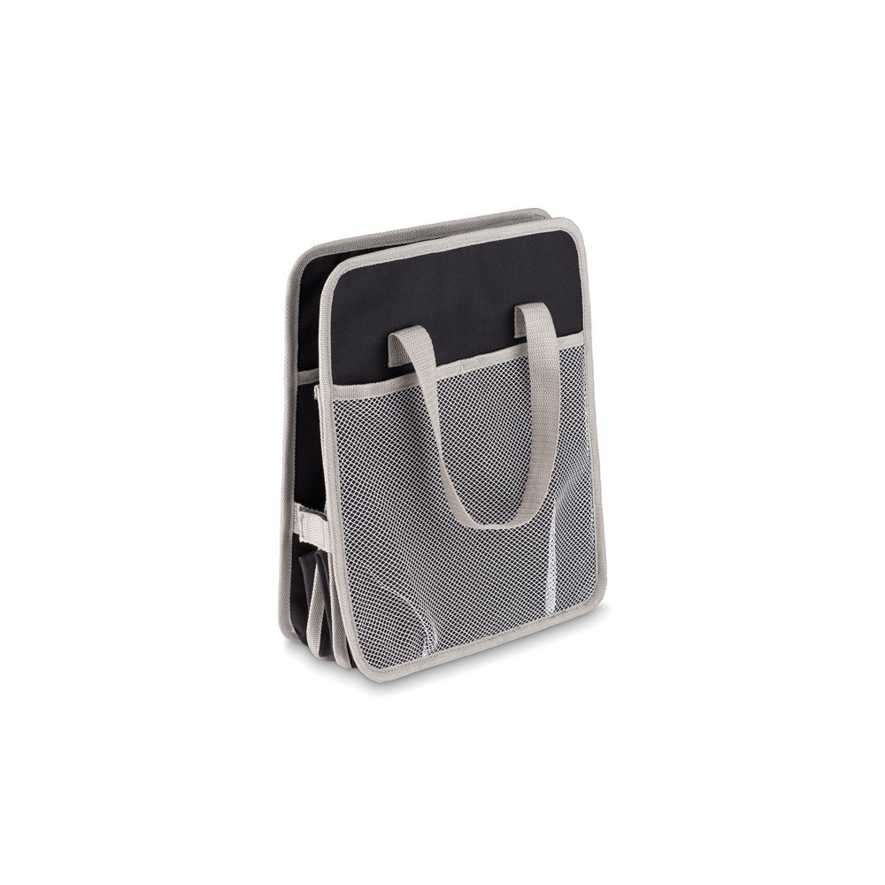 Składany organizer samochodowy z poliestru 600D, wyposażony w boczną kieszeń z siatki.