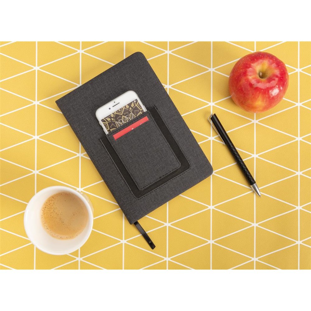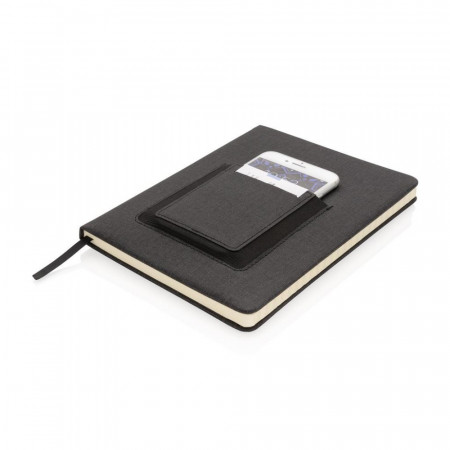 Notatnik A5 (80 kremowych kartek 78 g/m2), posiada kieszeń na telefon i miejsce na kartę kredytową, tasiemka zakładkowa